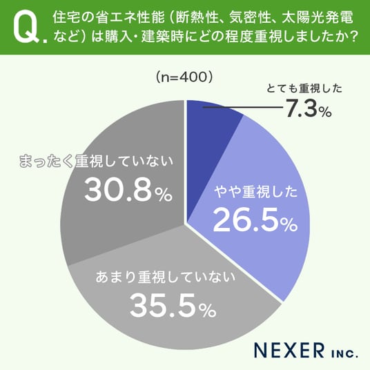 続いて、住宅の購入・建築時に省エネ性能をどの程度重視したかについて聞いてみました。