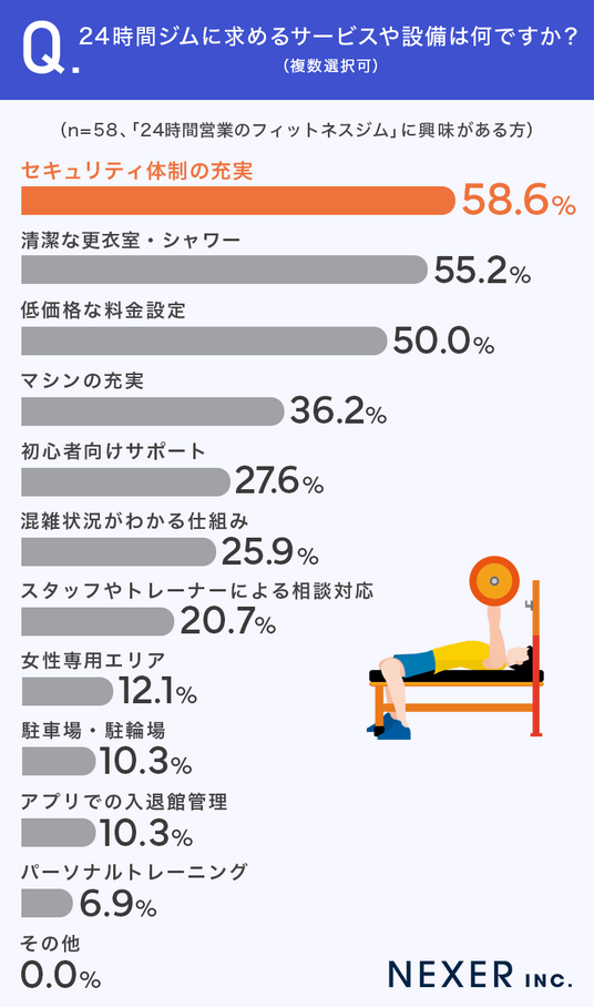 また、「女性専用エリアがあれば安心」という声や、「地方には24時間ジムが少ない」という立地面の課題も挙がっています。設備の清潔さや環境への期待も高く、利便性だけでなく「安心して通い続けられるかどうか」が利用を左右する大きなポイントになっているようです。