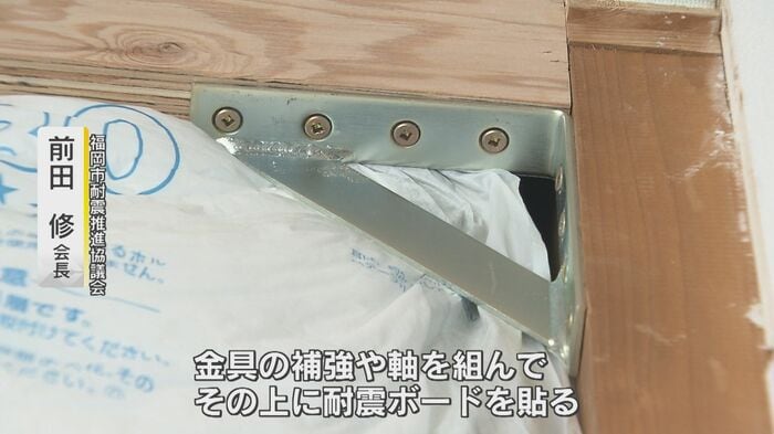 前田さんは、「金具の補強や軸を組んで、その上に耐震ボードを貼る」ことで、壁の強度を今の3.5倍に上げ、現行の耐震基準まで高めると話す。