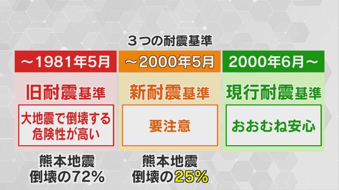 地震に対する最低限の強度を定めた耐震基準は、3段階に分かれている。1981年5月までは、旧耐震基準で、震度5強程度しか想定されておらず、大地震(震度6程度)の場合、倒壊する危険性が高いとされている。