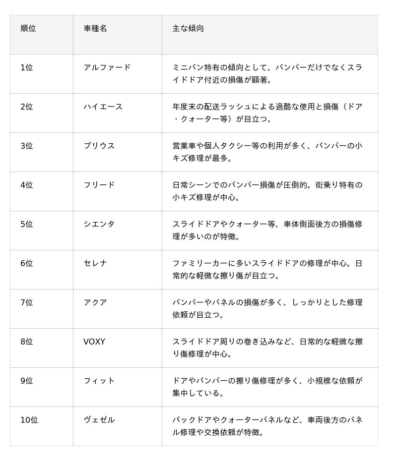【2026年3月】車種別 修理車ランキング トップ10全国31店舗で集計した4,225件のデータを車種別にランキング化しました。日常使いや業務で活躍する人気車種が上位にランクインしており、車種ごとに損傷しやすい箇所(弱点)の傾向が見られました。