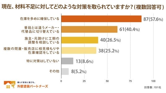 各塗装店は「在庫の確保」や「代替品の利用」など、独自のネットワークや工夫で急場を凌いでいる状況です。しかし、26.5%は「工期の調整」を施主に相談せざるを得ない状況にあり、消費者(施主)側にも影響が波及し始めていることが伺えます。