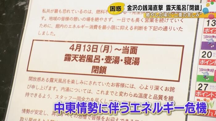 「こんなところに影響があるなんて、びっくりだね」――。利用客の口から漏れた率直な驚きが、この問題の本質を突いている。遠い中東の地で続く緊迫した情勢が、石川県金沢市の温浴施設「和おんの湯」の露天風呂を閉鎖に追い込んだ。重油の供給不足と価格急騰という「二重の苦しみ」に直面した施設は、1日も長く営業を続けるための苦渋の決断を迫られている。