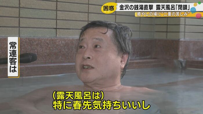 「特に晴れた日なんか気持ちいいし、家の風呂や、内風呂と違う魅力があるんで、その魅力のために来ているようなもんなんで。早く再開してほしいと思います。」