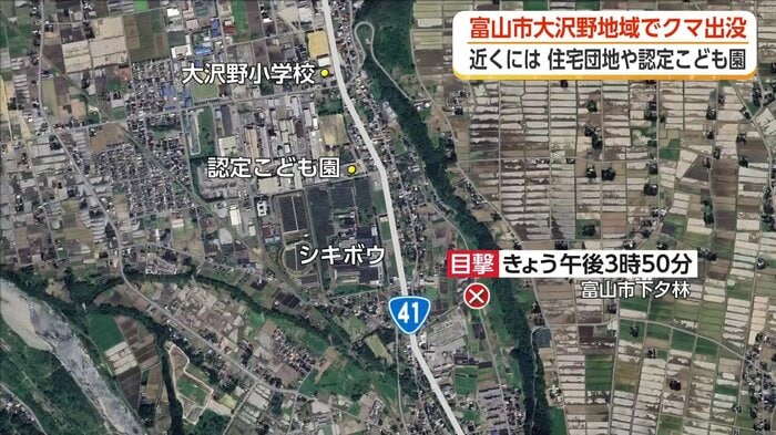 警察によりますと、クマが目撃されたのは富山市下タ林地内の国道41号から約150メートルほど東に入った所です。
