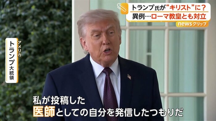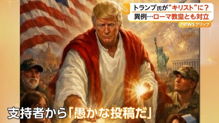 トランプ大統領がキリストに似た自身の画像をSNSに投稿した。しかし、支持者らからも批判の声が上がり、その後削除する事態となった。トランプ大統領は「キリストではなく、医師を表現した」と説明したが、イランでの戦闘停止を呼びかけたローマ教皇・レオ14世への批判とともに投稿されたもので、教皇は「トランプ政権を恐れはしない」と反論。アメリカ大統領とカトリック教会トップの異例の対立となっている。