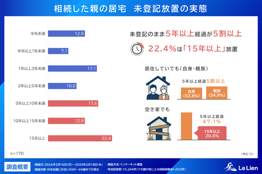 相続した親の居宅の16.1%が未登記、その半数以上が「5年以上」放置