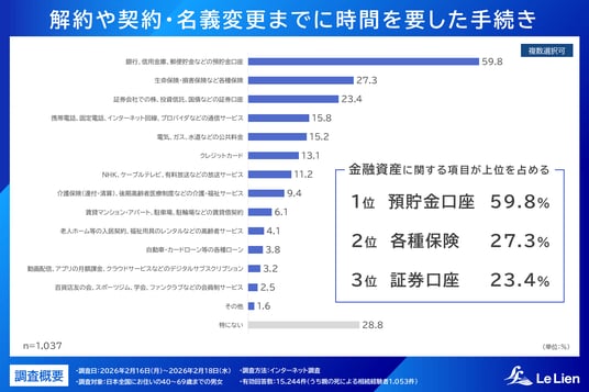 解約や名義変更の手続きにおいて「時間を要した」と回答した項目は、上位 3 つを金融資産に関する手続きが占める結果となりました。