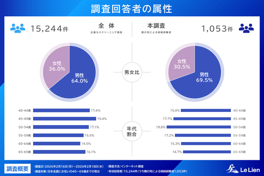 相続・終活のプラットフォーム「みんなの相続窓口」「みんなの終活窓口」を展開する株式会社ルリアン(京都府京都市、代表取締役会長兼 CEO:藤巻 米隆)は、15,244 人(うち親の死による相続経験者 1,053人)を対象とした「相続・終活に関する全国調査2026」を実施しました。今回は結果報告の第1弾として、4月27日の「相続土地国庫帰属制度」施行から 3 年を迎えるのを前に、親の死による相続経験者のデータに基づき、制度の認知度や不動産管理の実態を報告します。