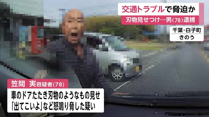 千葉県白子町で交通トラブルをきっかけに、相手の車のドライバーを刃物のようなものを見せて脅したとして、78歳の男が逮捕された。男は容疑を認めており、警察が当時の詳しい状況を調べている。