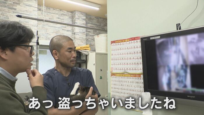 防犯カメラを確認する『もりまつ動物病院』の森松大智・院長が「ああ来た!」と思わず声をあげる。