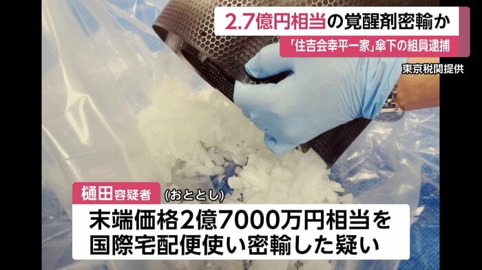 住吉会幸平一家の傘下組織の組員・樋田涼容疑者(30)は2024年、密売目的でアメリカから覚醒剤約5キロ、末端価格2億7000万円相当を国際宅配便を使って密輸した疑いが持たれている。