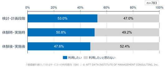 AIサービスの利用シーンを選択した回答者(n=783、「あてはまるものはない」と回答したn=259を除く)を対象に、重視する価値を満たすAIサービスに対する利用意向を調査した結果、「検討・計画段階」での利用意向が53.0%で最多となりました。AIサービスの設計においては、「体験時・実施時」の前の「検討・計画段階」に着目した付加価値の提供が重要であると考えられます(図表7)。