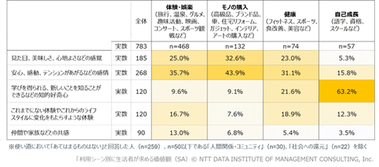 お金の使い道の上位3項目である「体験・娯楽」「モノの購入」「健康」の利用シーンで生活者が求める価値は、「安心、感動、テンションがあがるなどの感情」が最多でした。次いで、「見た目、美しさ、心地よさなどの感覚」が続きました。