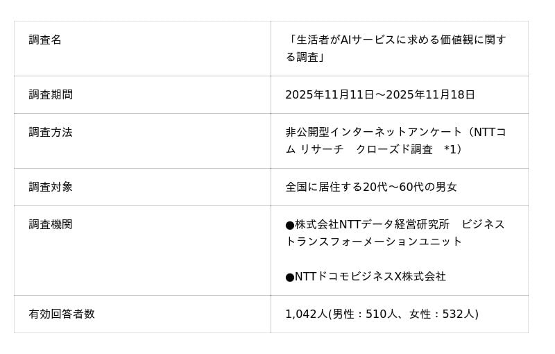 NTTドコモビジネスX株式会社(旧:NTTコムオンライン、本社:東京都品川区、代表取締役社長:稲葉 秀司、以下NTTドコモビジネスX)は、株式会社NTTデータ経営研究所(本社:東京都千代田区、代表取締役社長:山口 重樹、NTTデータ経営研究所)と共同で、全国の20代~60代の男女1,042人を対象に「生活者がAIサービスに求める価値に関する調査」を実施しました。