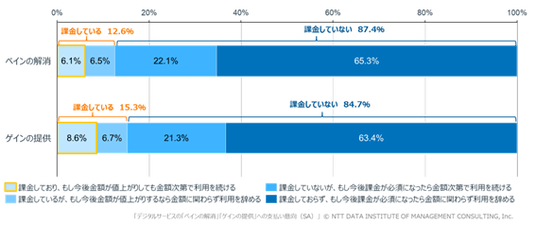 これに対し、デジタルサービスでは「負担の軽減」で12.6%、「付加価値の提供」で15.3%となり、付加価値を提供するサービスの課金意向が相対的に高い傾向がみられました(図表5)。