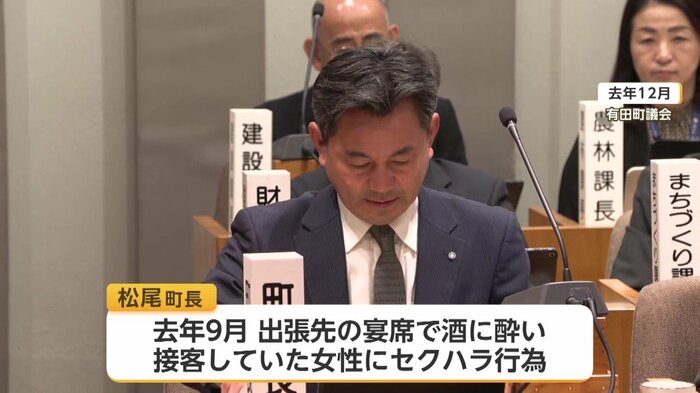 当時、町長を務めていた松尾氏は、去年9月、出張先の宴席で酒に酔い、接客していた女性にセクハラ行為をしていたことが発覚。