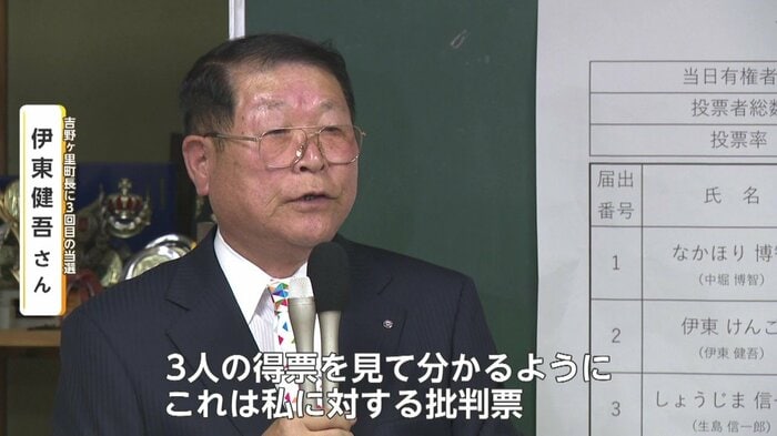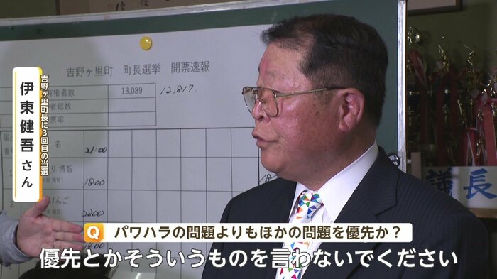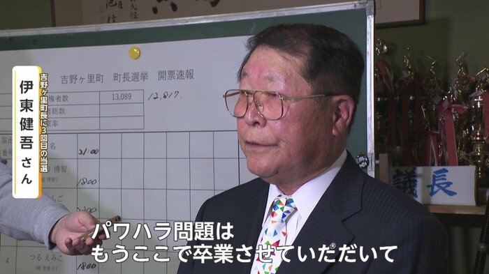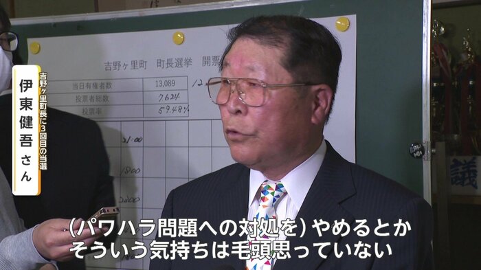一方、吉野ヶ里町長選では同じくハラスメントが問題となった現職の伊東健吾氏が3回目の当選を果たした。しかし伊東氏の得票数は一騎打ちだった前回と比べ4割減少した。