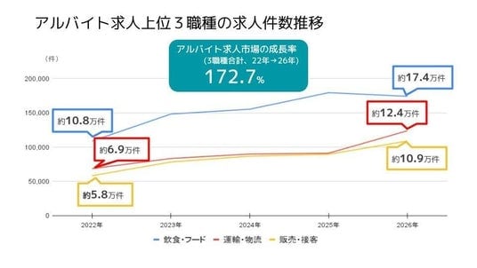 「飲食・フード」「運輸・物流」「販売・接客」の3職種の求人件数推移を見てみると、いずれの職種も2022年→2026年にかけて求人件数が右肩上がりとなっていました。3職種の求人件数を合計した成長率(2022年→2026年)は172.7%と、人手不足によってアルバイト求人ニーズが加速していることがうかがえます。