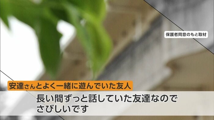 よく一緒に遊んだという友人は「長い間ずっと話していた友達なのでさびしいです。優しい子で、誰にでも話せる子でした」、「いろいろな思いがあってみんな心配ですけど、同じ気持ちなんで頑張りたい、こらえて…」などと話した(保護者同意のもと取材)。