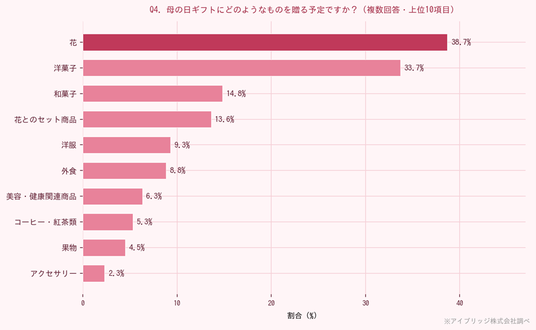 「花」(38.7%)が最も多く、「洋菓子」(33.7%)が続きました。食べ物系ギフトも多く選ばれており、一定のニーズがうかがえます。