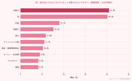 「洋菓子」(41.0%)が最も多く、「花」(40.3%)が続きました。また、「外食」(18.1%)や「旅行」(11.8%)など、体験型ギフトを希望する回答も見られます。