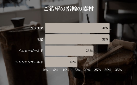 指輪の素材に関するアンケートでは、「プラチナ」「未定」がそれぞれ31%で同率首位となりました。続いて「イエローゴールド」が23%、「シャンパンゴールド」が15%という結果となっています。