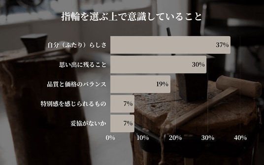 指輪選びで大切にしていることを尋ねた設問では、「自分(ふたり)らしさ」が37%でトップとなりました。次いで「思い出に残ること」が30%、「品質と価格のバランス」が19%、「特別感を感じられるもの」「妥協がないか」がそれぞれ7%という結果となっています。