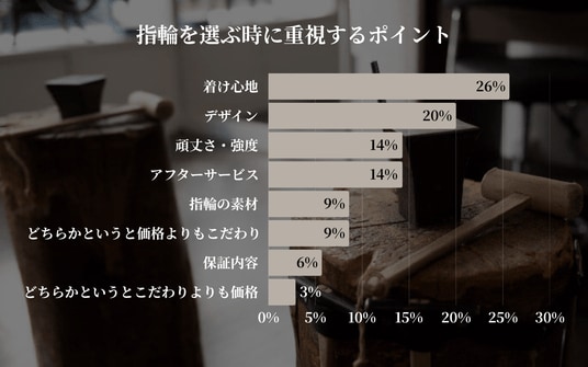 指輪選びで重視するポイントを尋ねた設問では、「着け心地」が26%でトップとなりました。以下、「デザイン」が20%、「頑丈さ・強度」「アフターサービス」がそれぞれ14%、「指輪の素材」「どちらかというと価格よりもこだわり」がそれぞれ9%、「保証内容」が6%、「どちらかというとこだわりよりも価格」が3%という結果となっています。