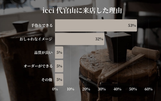 来店のきっかけを尋ねた設問では、「手作りできる」が53%と過半数を超えてトップとなりました。以下、「おしゃれなイメージ」が32%で続き、「品質が良い」「オーダーができる」「その他」がそれぞれ5%と並ぶ結果となっています。