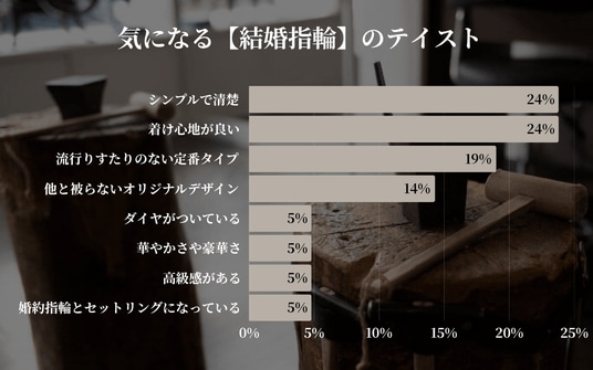 結婚指輪のデザインに関するアンケートでは、「シンプルで清楚」「着け心地が良い」が各24%で同率トップとなりました。続いて「流行りすたりのない定番タイプ」が19%、「他と被らないオリジナルデザイン」が14%と続き、「ダイヤがついている」「華やかさや豪華さ」「高級感がある」「婚約指輪とセットリングになっている」がそれぞれ5%という結果となっています。