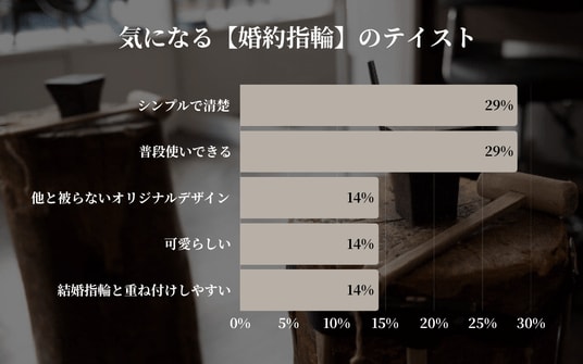婚約指輪のデザインに関するアンケート結果では、「シンプルで清楚」「普段使いできる」が各29%でトップに並びました。続いて「他と被らないオリジナルデザイン」「可愛らしい」「結婚指輪と重ね付けしやすい」がそれぞれ14%と並ぶ結果となっています。