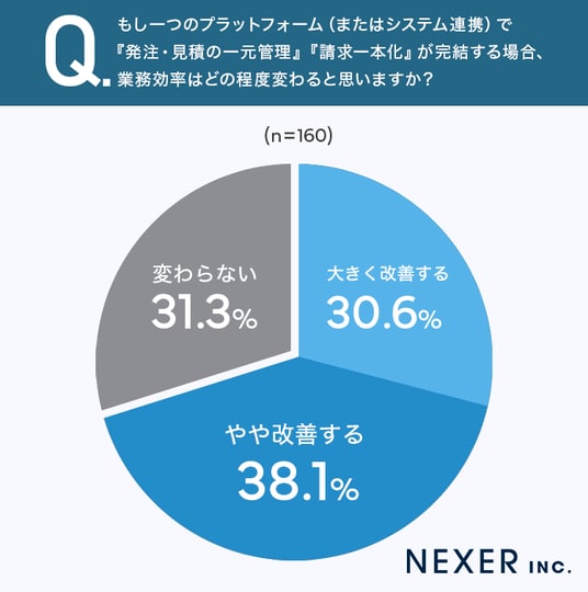 最後に、一つのプラットフォームやシステム連携で「発注・見積の一元管理」や「請求一本化」が完結する場合、業務効率はどの程度変わると思うか聞いてみました。