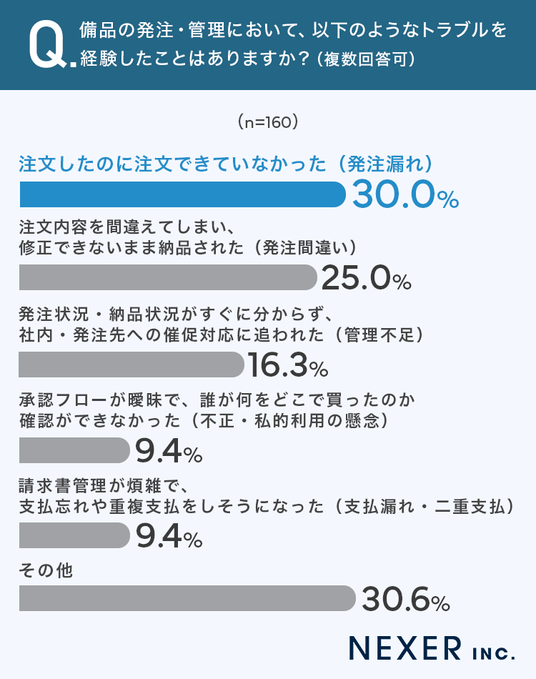 こうしたミスは、備品が必要なタイミングに間に合わないだけでなく、確認や再発注の手間も増やします。業務の遅れや余計なコストにもつながるため、見過ごせない課題といえそうです。