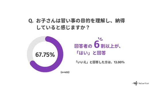 「お子さんは習い事の目的を理解し、納得していると感じますか?」という質問に対し、「はい」と回答した方は67.75%でした。