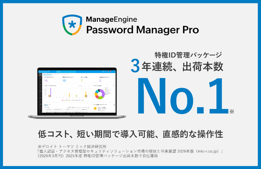 ゾーホージャパン株式会社(代表取締役:マニカンダン・タンガラジ、本社:横浜市、以下、ゾーホージャパン)は、ManageEngineの特権ID管理ツール「Password Manager Pro(パスワードマネージャープロ)」が、デロイト トーマツ ミック経済研究所株式会社の最新調査*により、2025年度における国内市場の特権ID管理パッケージの出荷本数において、首位を獲得したことをお知らせします。なお、2023年度より3年連続の首位獲得となります。