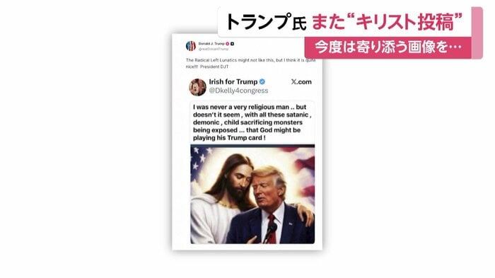 アメリカのトランプ大統領は15日、イエス・キリストとみられる人物と寄り添う画像をSNSに投稿した。