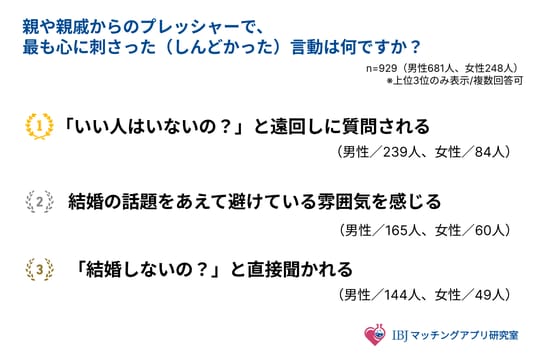 親や親戚からのプレッシャーで最も心に刺さった(しんどかった)言動の1位は、「『いい人はいないの?』と遠回しに質問される」(男性239人、女性84人)でした。次いで2位は、「結婚の話題をあえて避けている雰囲気を感じる」(男性165人、女性60人)となり、「『結婚しないの?』と直接聞かれる」を上回る結果となりました。
