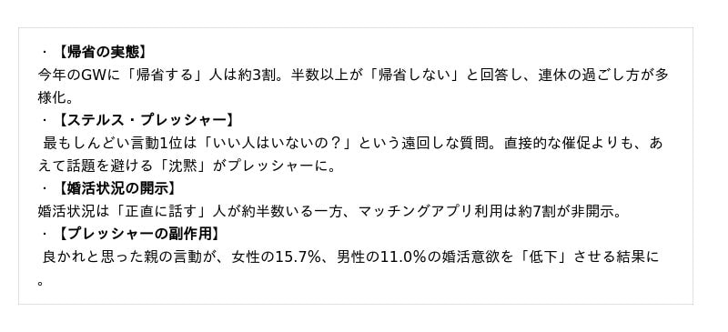 【GW帰省率 約3割】遠回しな言動や沈黙が、婚活意欲に影響する傾向も