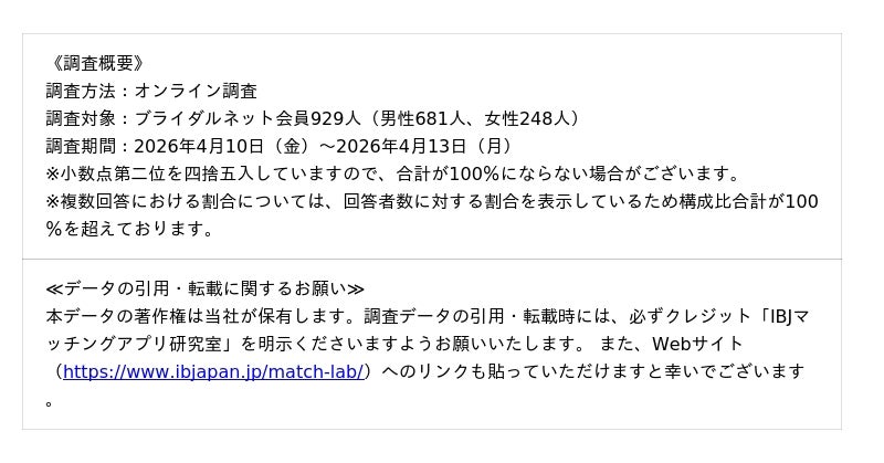 日本で最も多くの成婚を創出¹している株式会社IBJ(本社:東京都新宿区、代表取締役社長:土谷健次郎、東証プライム:6071)が運営する「IBJマッチングアプリ研究室」は、婚活アプリ「ブライダルネット」の利用者929名を対象に、「GWの帰省と、家族とのコミュニケーション」に関するアンケート調査を実施しました。