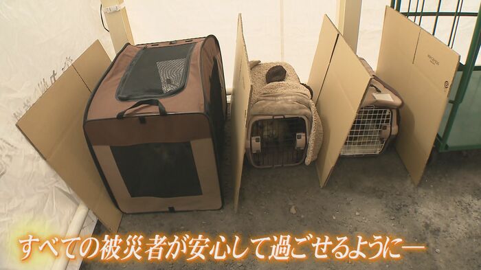 「難所の中に人とペットが一緒に入れる所が少なくて。ペットだけを置いて、人間は別の場所にと、どうしてもせざるを得なくなった時にケージを並べて…中でペットが安全に避難できるように」と佐藤さんは語る。