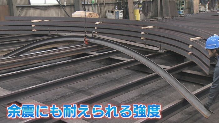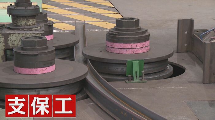 「掘削した地盤を支えるトンネル用の『支保工』という部材の鉄を曲げる技術を使っています」と話す『九州鉄道機器製造』の鎌田厚志さん。余震にも耐えられる強度を確保しているとう。
