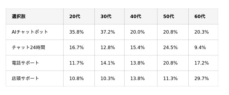 20~30代はAIチャットボットが35%超と突出する一方、60代は「店頭サポート」が29.7%で最多。年代ごとにニーズが大きく異なり、多様なチャネル提供が求められます。