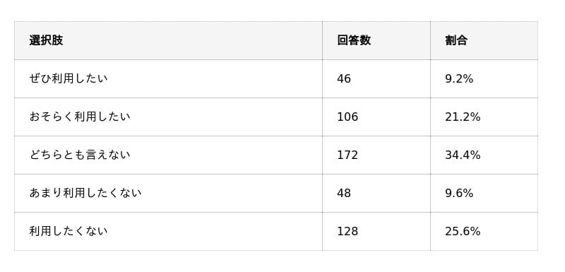 利用意向あり(30.4%)と否定的(35.2%)が拮抗し、「どちらとも言えない」が34.4%で最多。仕組みや安全性の訴求次第で意向が変わる可能性があります。