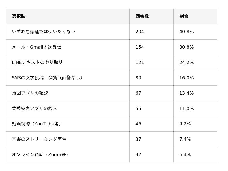 「低速では使いたくない」が40.8%で最多ですが、テキスト系(メール30.8%、LINE 24.2%)は許容される傾向にあります。動画・音楽・通話など帯域が必要な用途は1割未満でした。