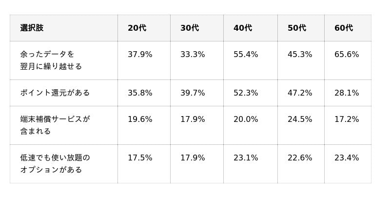 「データ繰り越し」は60代で65.6%と特に高く、年代が上がるほど無駄を避けたい傾向が顕著です。次いで「ポイント還元」(38.8%)、「端末補償」「低速使い放題」(各19.6%)が続きます。