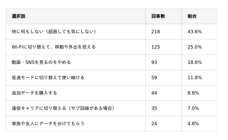 最多は「特に何もしない」(43.6%)で、データ不足を深刻視しないユーザーが多数派です。対処する層は「Wi-Fiに切り替え」(25.0%)や「動画・SNSの利用制限」(18.6%)で通信量を抑えています。
