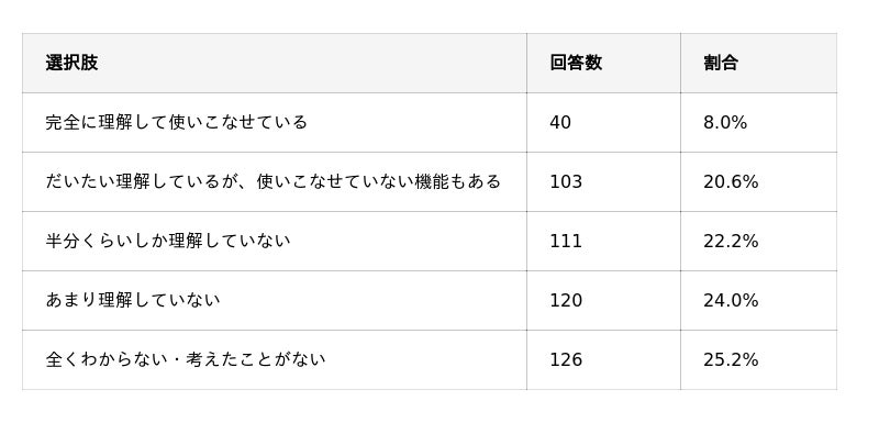 格安SIMの各機能の理解度を尋ねたところ、「完全に理解して使いこなせている」はわずか8.0%。約半数(49.2%)が「あまり理解していない」以下と回答しました。