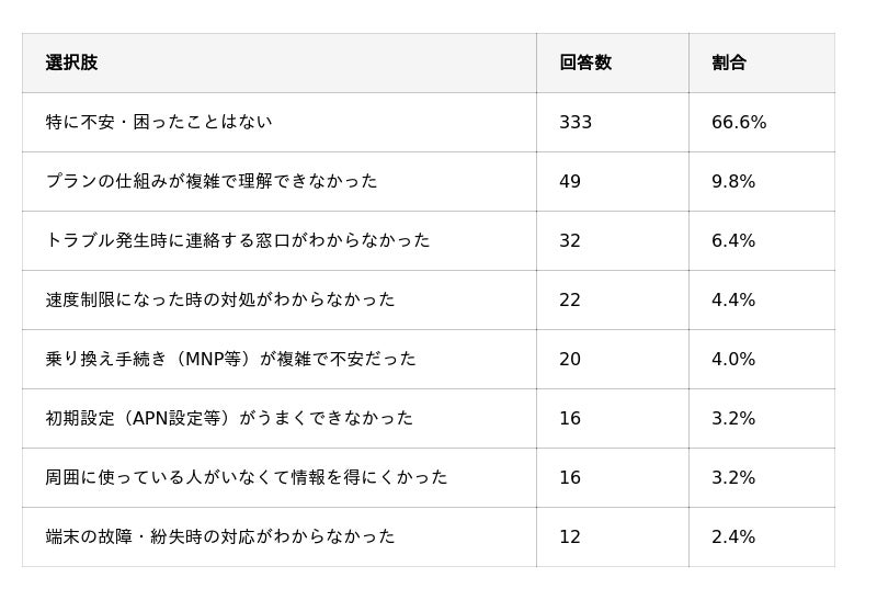 格安SIMで困った経験を尋ねたところ、66.6%が「困ったことはない」と回答。困った経験がある層では「プランの仕組みが複雑」(9.8%)と「トラブル時の連絡窓口がわからない」(6.4%)が上位でした。