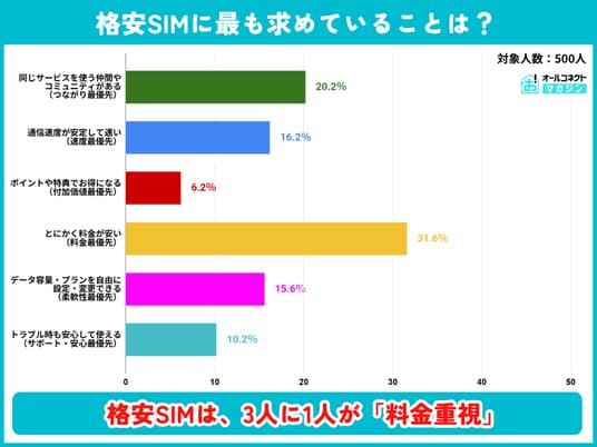 ・格安SIMに最も求めるのは「料金の安さ」(31.6%):一方「コミュニティ」(20.2%)が2位と高い